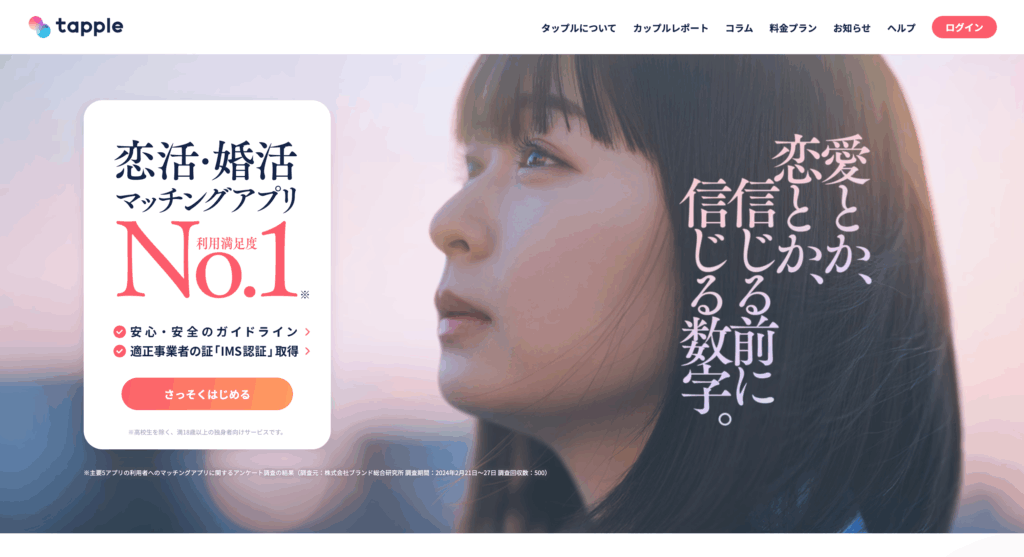繊細な性格の人は、価値観や内面との共感を大切にします。withは心理学・統計学に基づいた性格診断や価値観診断が豊富で、深いつながりが期待できる相手と出会いやすい設計です。さらに、24時間体制の監視や通報システム、TRUSTe・IMS認証の取得で安全性も高いです。