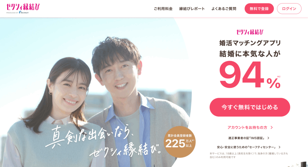 リクルートによる結婚支援ブランド「ゼクシィ」の婚活アプリ。価値観一致を重視したマッチング機能に加え、業界初のコンシェルジュによる「デート調整代行」など、手厚いサポート体制が整っています。5ヶ月以内の出会い率が約80%と成果も高いのが特長です。